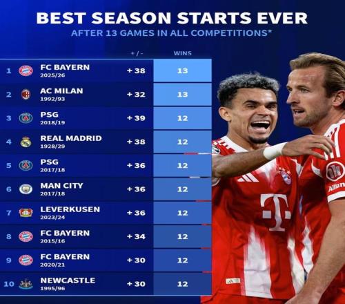 北京时间10月28日,德转统计出了单赛季各项赛事前13场比赛过后,欧洲五大联赛球队的历史10佳开局,本赛季的拜仁慕尼黑以13战全胜且净胜38球超越了1992-93赛季的AC米兰排名第一。