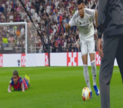 本场第3次落后的皇马随后做出换人调整,姆巴佩替补登场复出,补时阶段,姆巴佩抢断亚马尔,随后带球推进反击,德容协防过来有点脏的亮鞋钉暴力将姆巴佩铲倒,主裁也很果断,直接红牌将德容罚下。皇马随后获得了人数上的优势,但这个补时并未能像上半时的补时连进2球,最终皇马2:3不敌巴萨。巴萨也就赢下了近4年连续在西超杯决赛中上演的西班牙德比中的3场,连续2年击败皇马夺冠,姆巴佩在皇马依然是0冠。
