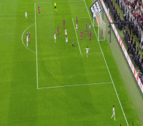 上半时补时阶段已经进了2个球,然而莱万这个进球竟还不是上半时最后的进球,又过了2分钟,皇马右侧角球机会,赫伊森后点高高跃起头槌攻门,BOOM的一声皮球杯门框挡了出来,贡萨洛和佩德里争抢第2落点,佩德里身后铲倒贡萨洛,贡萨洛摔倒的瞬间右脚凌空一撩,皮球击中横梁下沿弹入网窝,皇马半场结束前还是2:2扳平了比分。