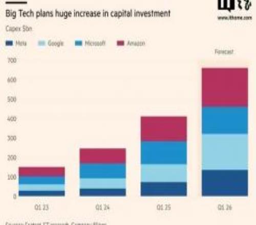 金融时报昨日(2 月 6 日)发布博文,报道称为争夺 AI 霸权,亚马逊、谷歌、微软和 Meta 宣布今年(2026 年)资本支出将达到 6600 亿美元(IT之家注:现汇率约合 4.58 万亿元人民币),较 2025 年激增 60%,是 2024 年支出的两倍多。
