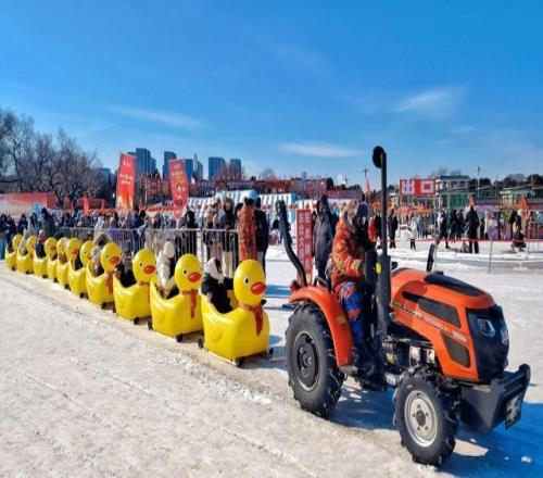 2026年2月1日,辽宁沈阳,新年春节将至,北陵冰雪大世界设置了冰滑梯、自行车乐园、网红铁牛拖拉机等游乐项目,吸引不少游客前来体验游玩。视觉中国 图
