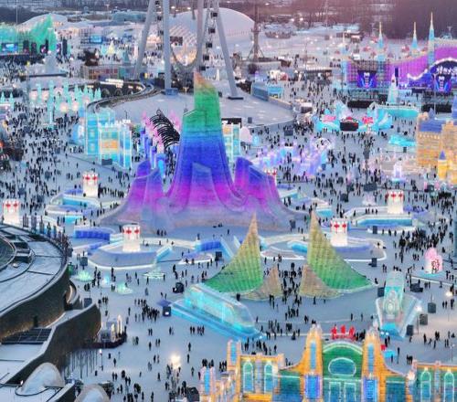 2026年1月27日,黑龙江省哈尔滨市,夜晚的冰雪大世界流光溢彩,宛如梦幻仙境。视觉中国 图