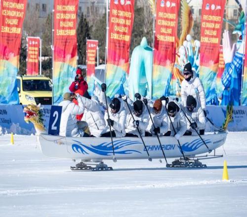 2026年2月2日,内蒙古锡林郭勒盟,五大洲冰上龙舟挑战赛在锡林浩特市锡林湖冰场举行。视觉中国 图