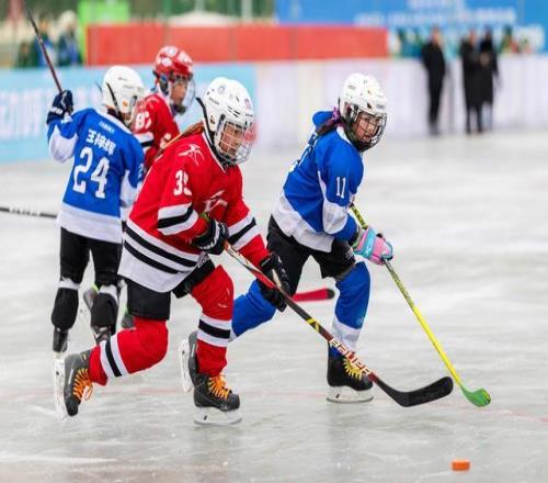 2026年1月25日,呼和浩特市大众冰雪季冰雪战队联赛活动现场,冰雪爱好者在冰球比赛中展开激烈角逐。视觉中国 图