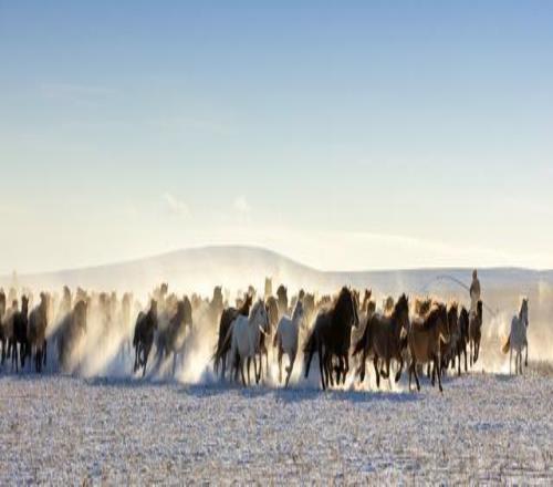 2026年1月10日,内蒙古乌拉盖管理区,第三届冰雪文旅主题活动开幕,万马在雪域高原上奔腾。视觉中国 图