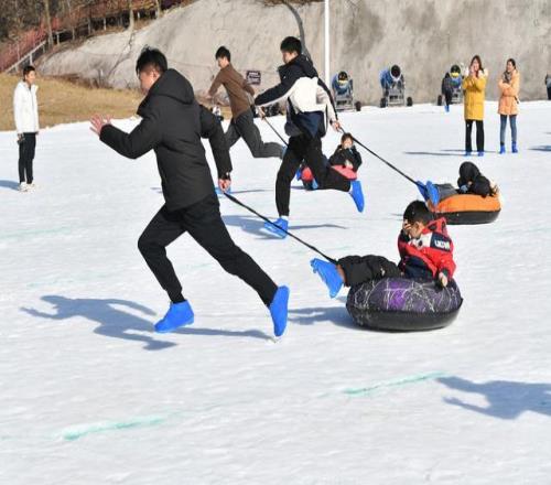 2026年1月17日,湖北襄阳,冰雪嘉年华活动上,人们参加亲子雪圈赛跑。视觉中国 图