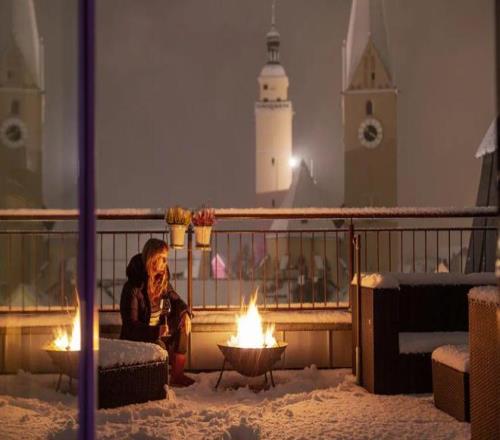 傍晚五点左右,整个小镇进入“黄金时刻”。夕阳为雪山披上一层金红色的外衣,远处的山峰剪影如画,岩壁的轮廓在光影中逐渐柔化,白天的锋利感被缓慢收起。滑雪者陆续下山,小镇的节奏随之放慢,切换为社交沙龙模式。