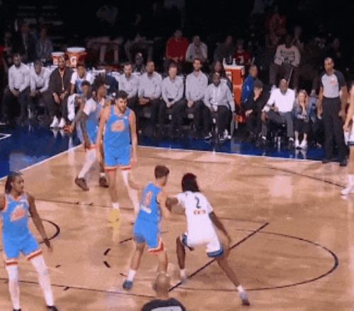 之后面对队友克林根,杨瀚森持球大跨步晃开大根完成上篮。